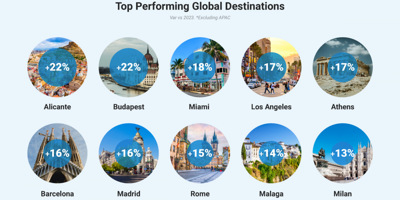 En esta clasificación hay otros tres destinos españoles, que aunque no en la misma medida que Alicante, también tienen incrementos significativos de dos dígitos. Es el caso de Madrid y Barcelona, ambas con un 16%, mientras que el incremento respecto a 2023 de Málaga es del 14%.